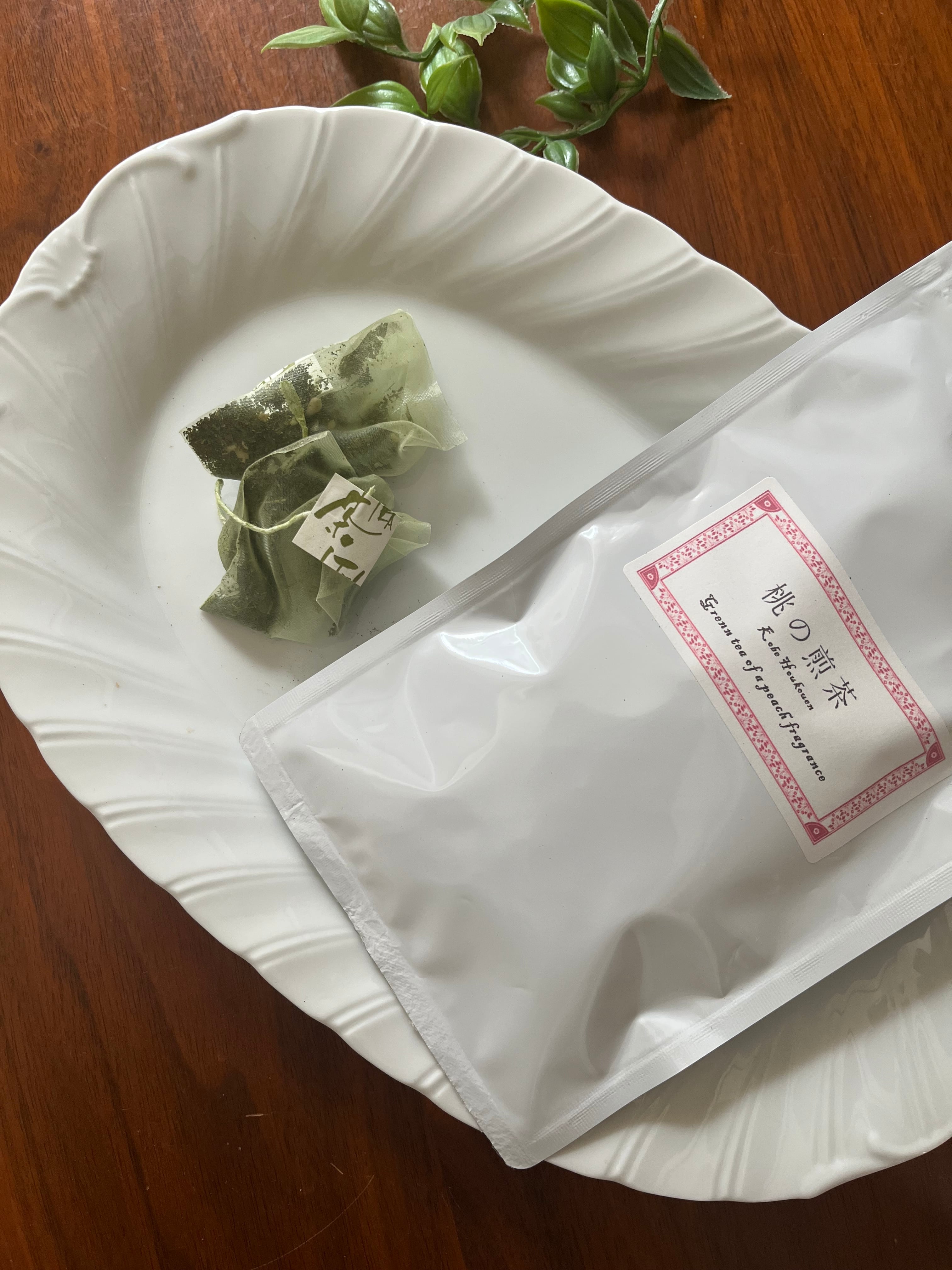 フリーズドライの桃が入ったフルーティな香りの煎茶パックです。5パック入り