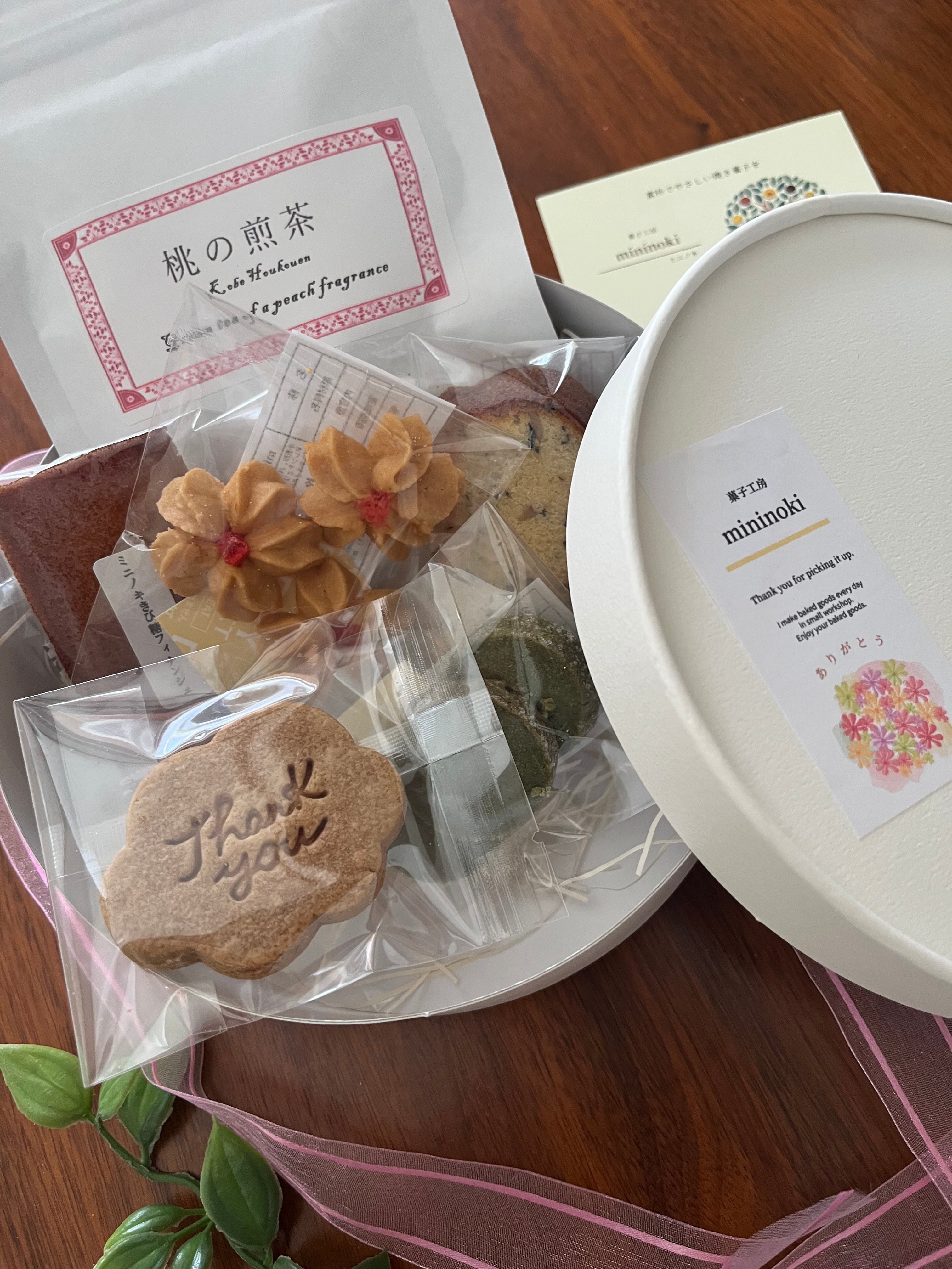 ミニノキの焼き菓子と神戸芳香園さまの桃の煎茶パック、いかがでしょうか?